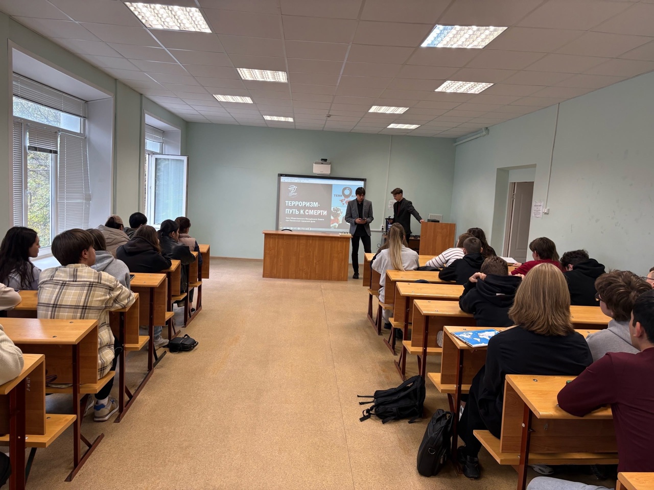 Студент группы 24ФПЗ1 Марат Максимов и член Молодежного совета при Пензенской Городской думе Кирилл Акатьев подготовили и провели для студентов групп 24ФПЗ1 и 25ФПЗ1 лекцию на тему "Терроризм - путь к смерти".